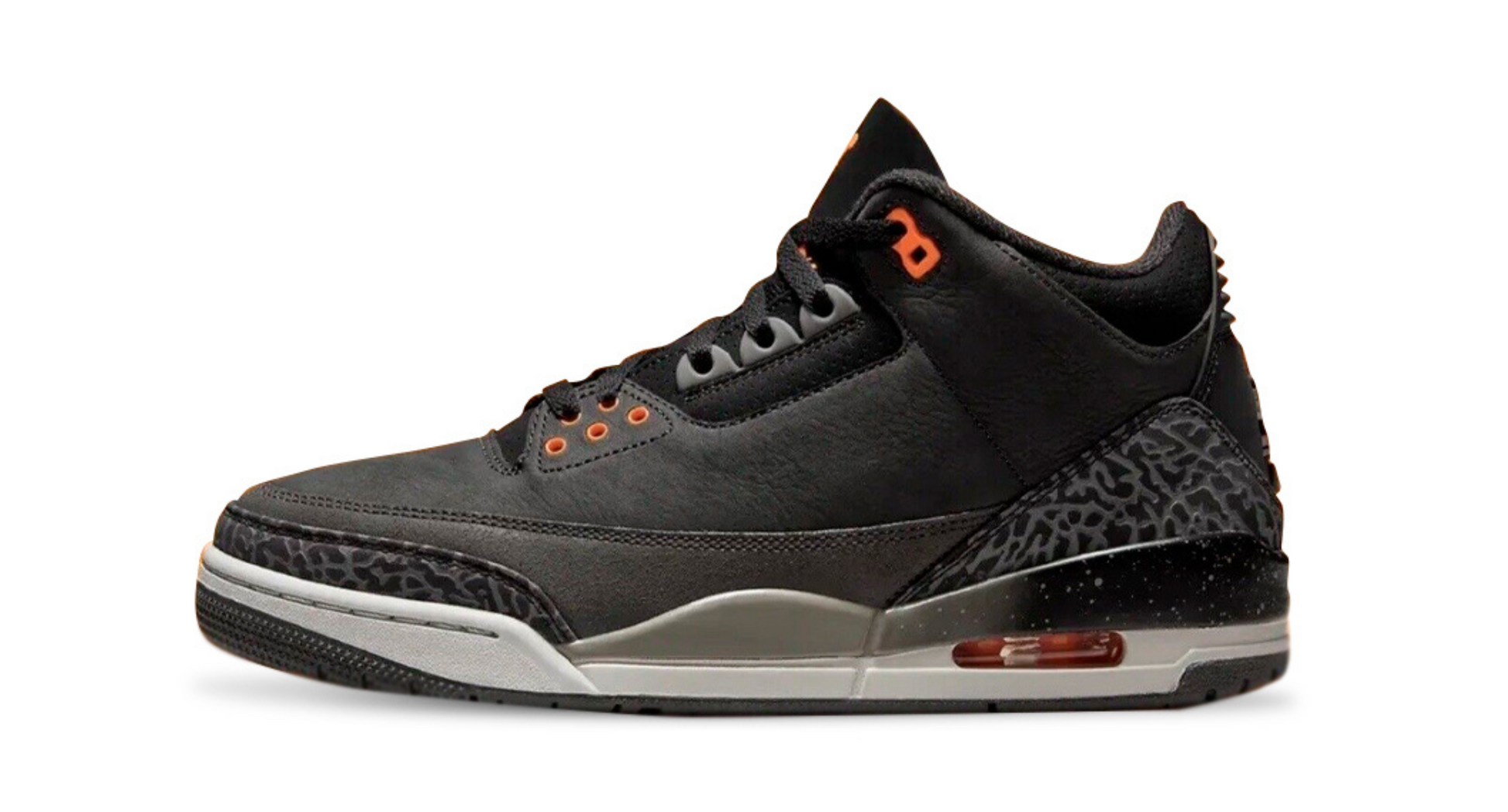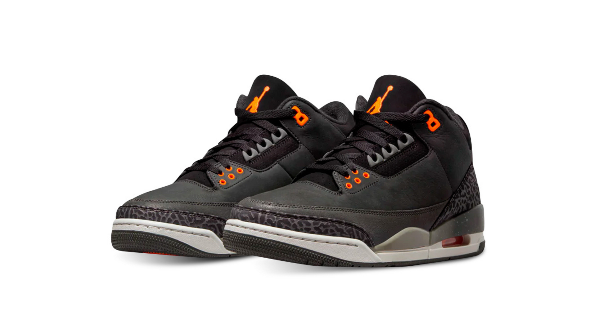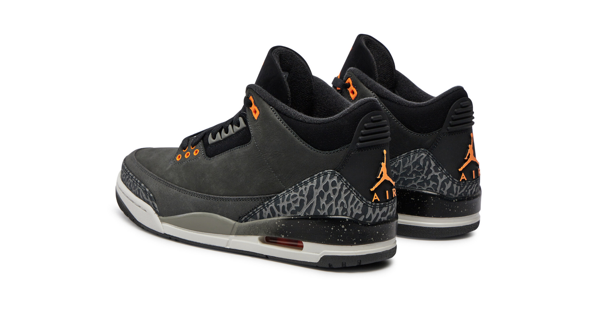 Jordan 3 Retro Fear Pack (2023) revine cu un design iconic din nubuc gri închis și detalii elephant print, păstrând esența originalului. Gulerul și limba din piele de căprioară neagră sunt accentuate de logo-ul Jumpman portocaliu. Ochiurile și toc-ul sunt în Total Orange, iar unitatea Air-sole portocalie adaugă confort. Combinația perfectă între performanță și stil, ideală pentru iubitorii de istoria jocului și sneakeri.
