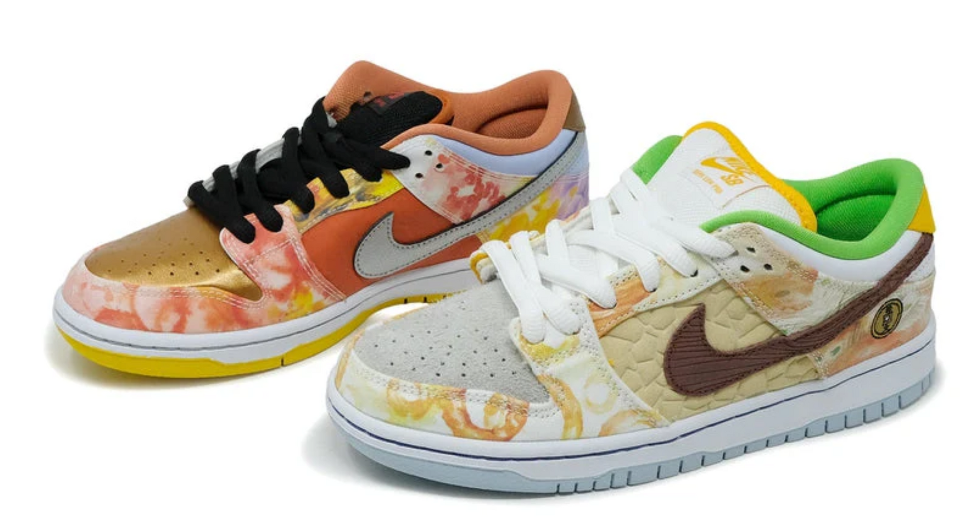 Nike Dunk Low Street Hawker aduce un mix inedit de materiale și culori inspirate de bucătăria chinezească. Cu un design asimetric, detalii pictate manual și caractere chinezești brodate pe călcâi, modelul celebrează cultura culinară asiatică într-o formă artistică.
